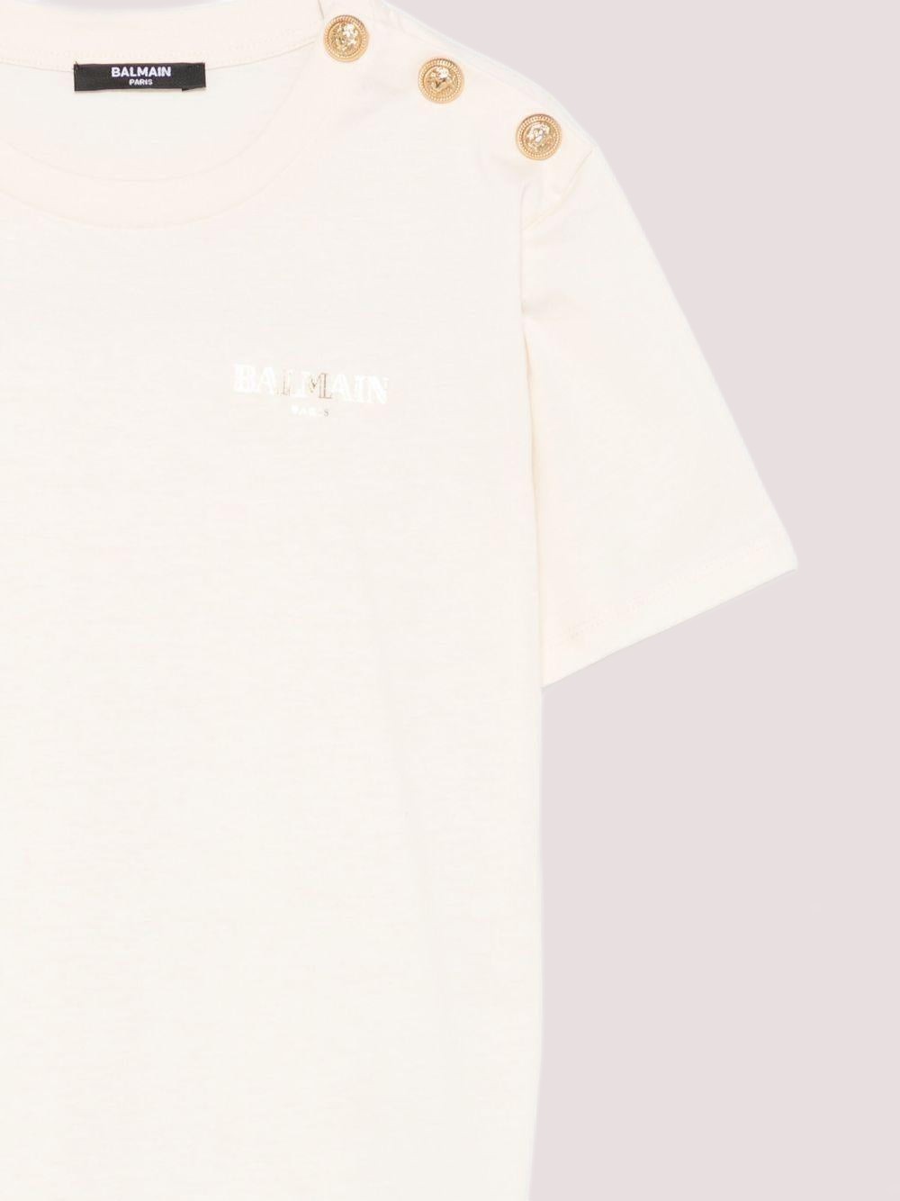 T-shirt per bambina Balmain Kids beige con ricamo logo e abbottonaturaRicamo con logo color oroManiche corteScollo rotondoTre bottoni color oroCotone