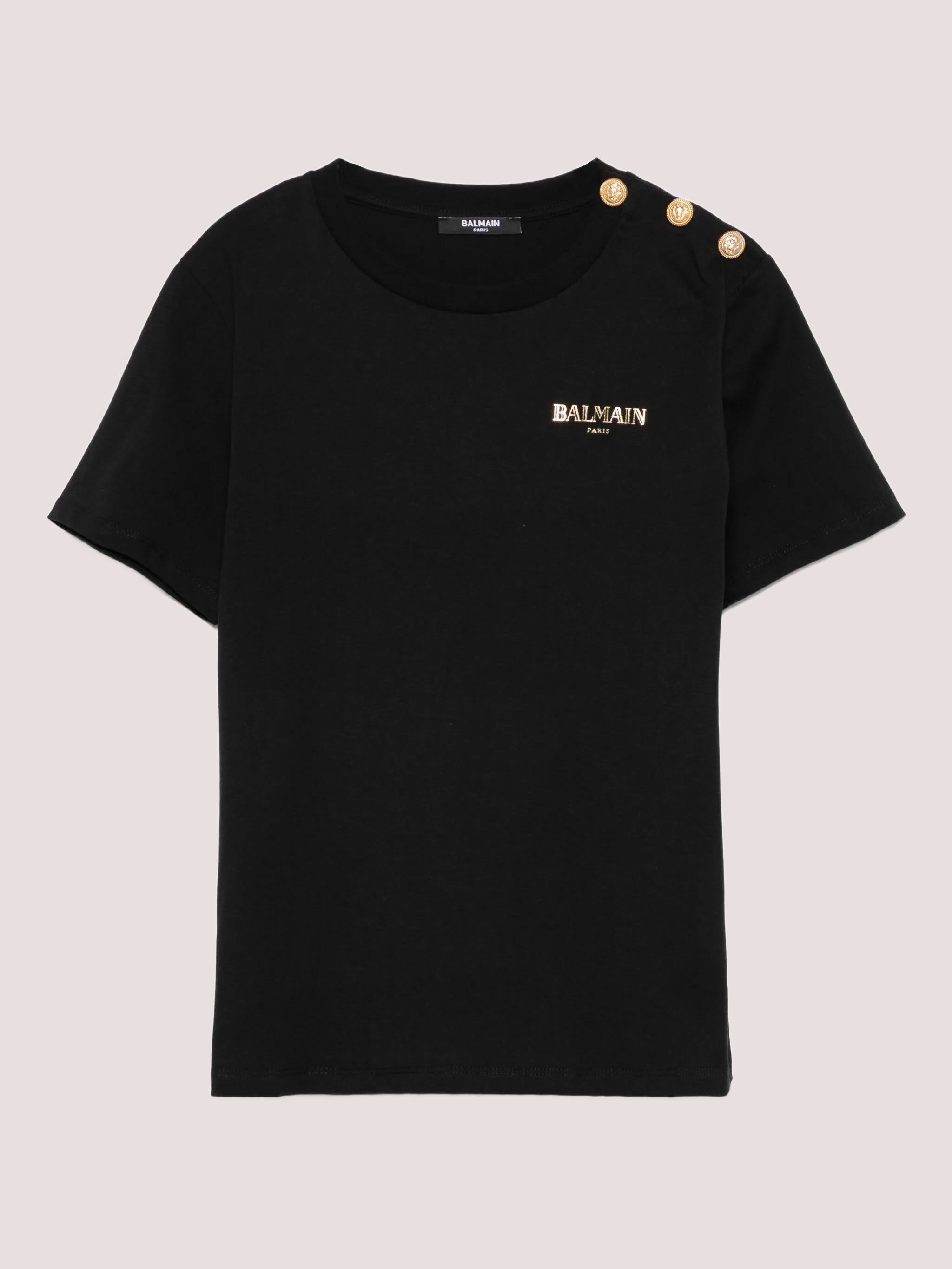T-shirt per bambina Balmain Kids nera con ricamo logo e abbottonaturaRicamo con logo color oroManiche corteScollo rotondoTre bottoni color oroCotone