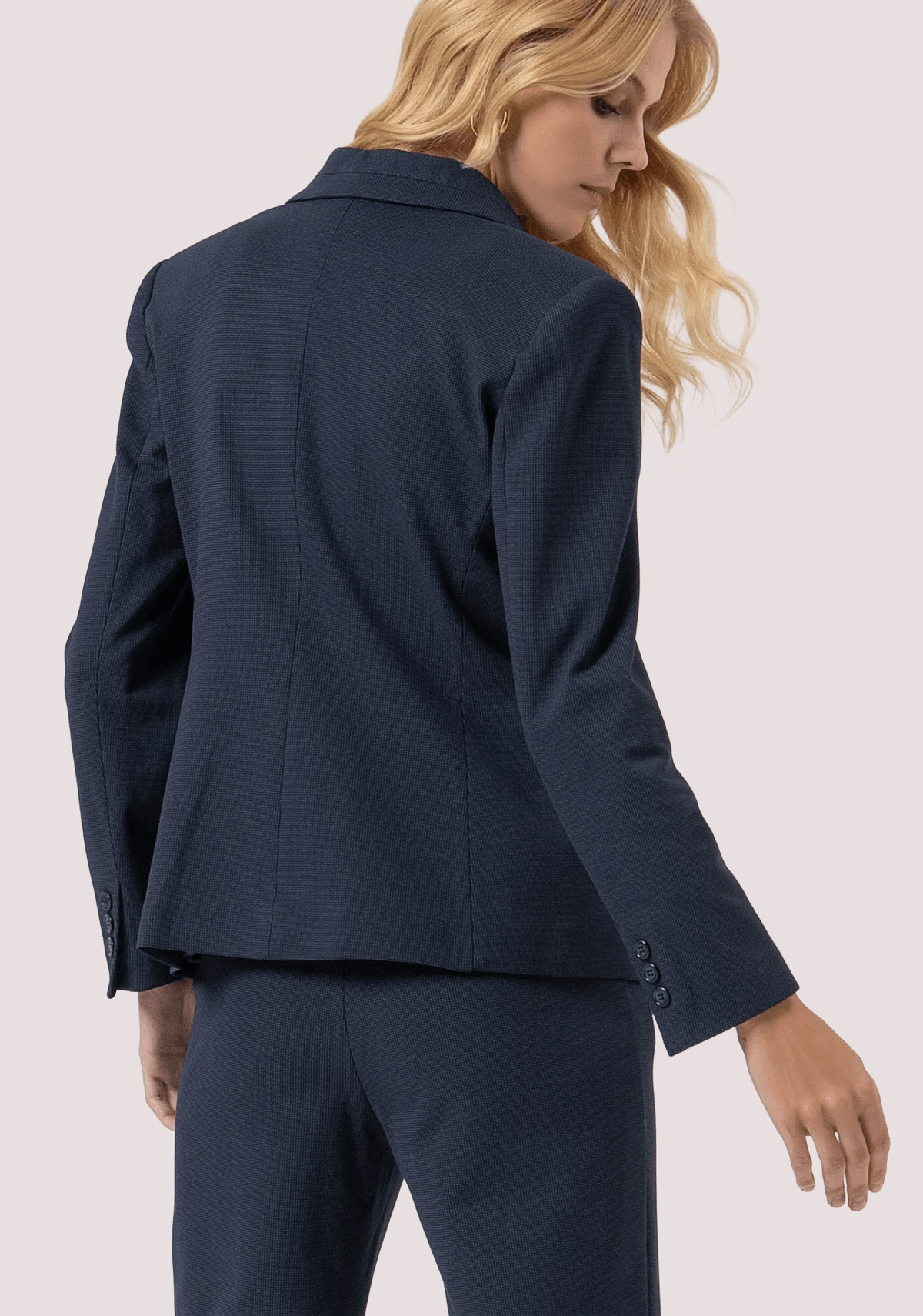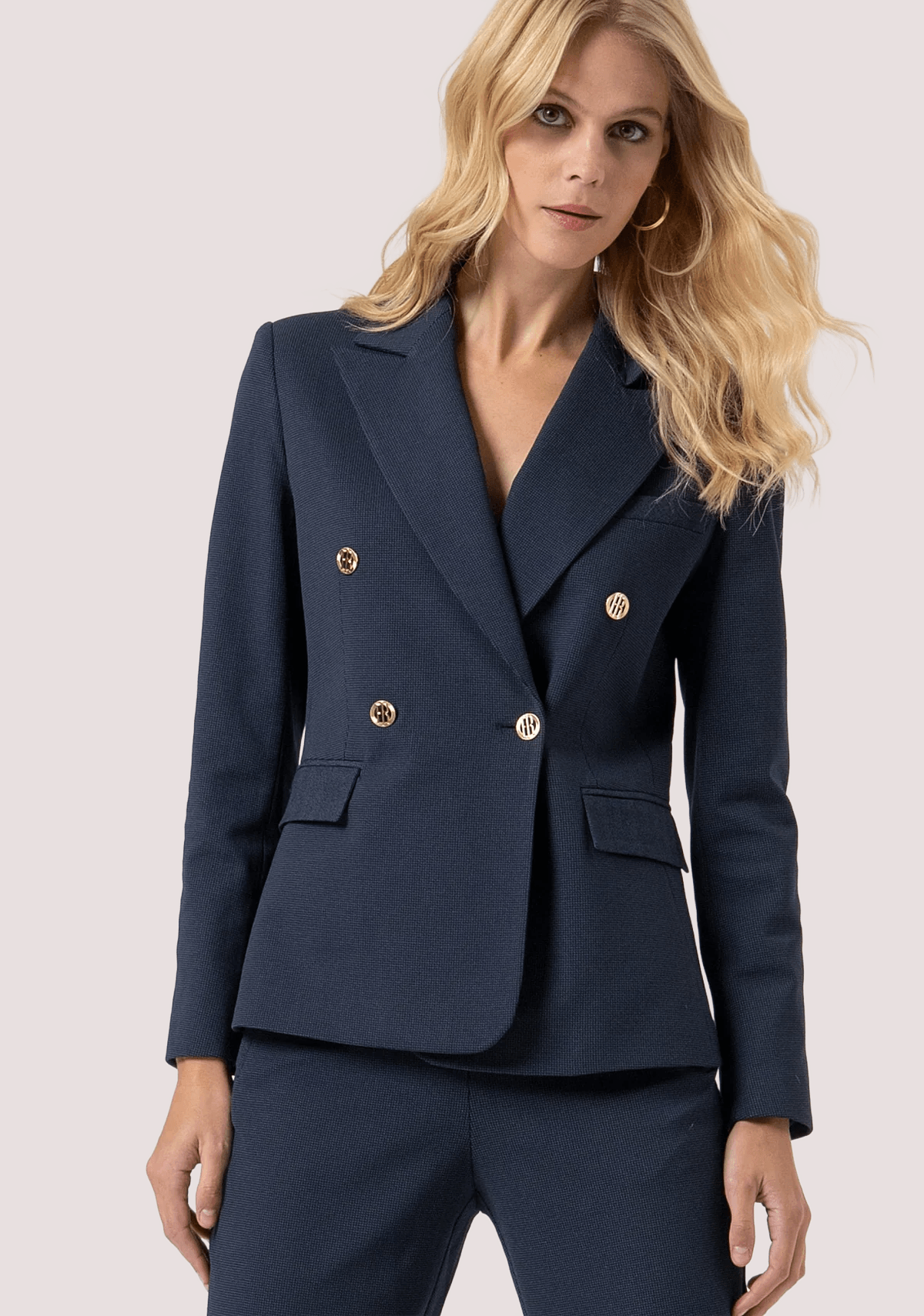 Giacca regular doppiopetto con fantasia micro quadri, revers a lancia, bottoni per apertura, tasche con pattina, e con maniche lunghe.