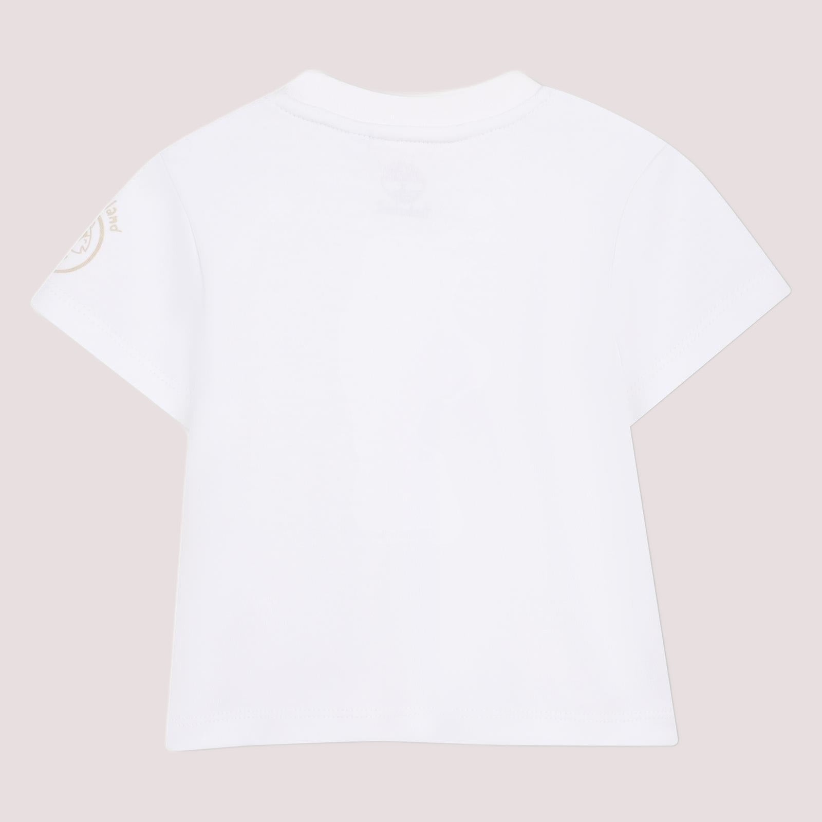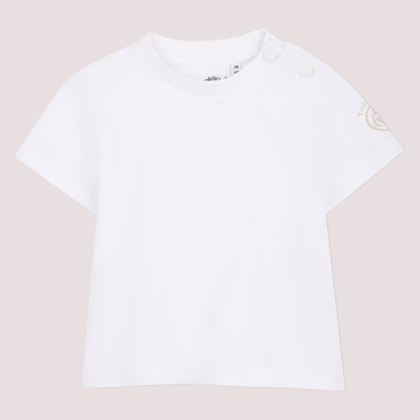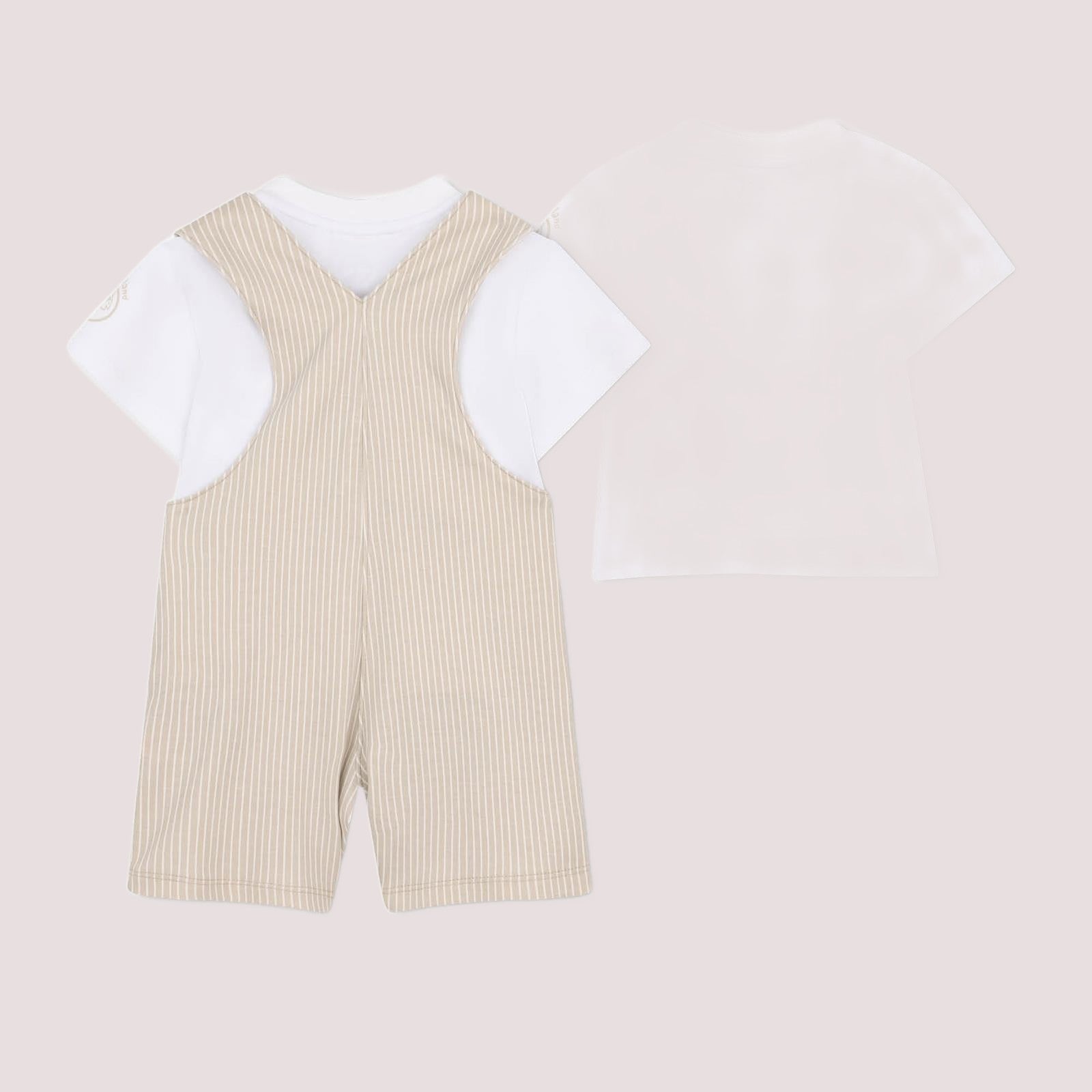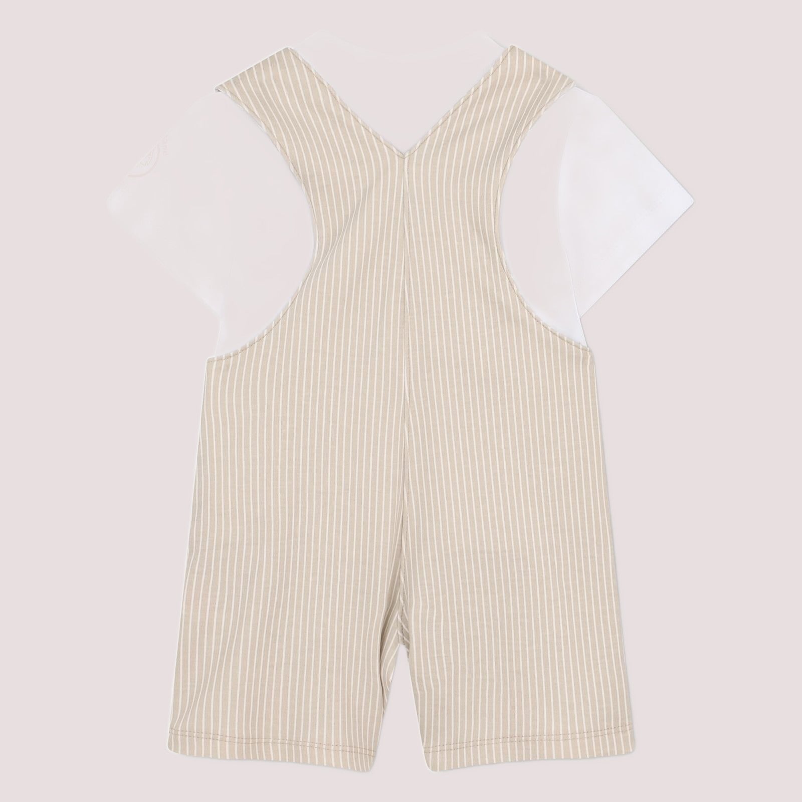 Completo t-shirt + salopette. T-shirt in 100% cotone interlock proveniente da agricoltura biologica, chiusura con bottoni a pressione sulla spalla, illustrazione stampata sulla manica. Salopette in 100% cotone interlock a righe, bottoni a pressione, tasca frontale con profili, etichetta frontale in silicone con marchio. *VENDUTO IN SCATOLA REGALO*