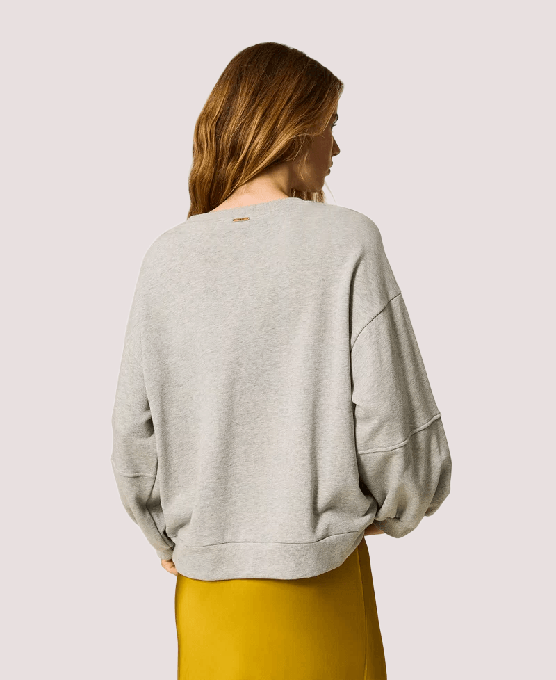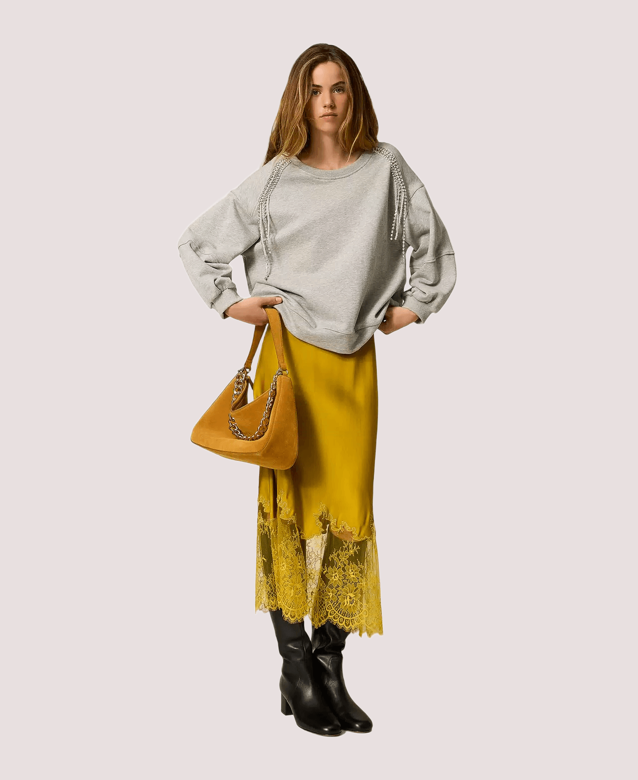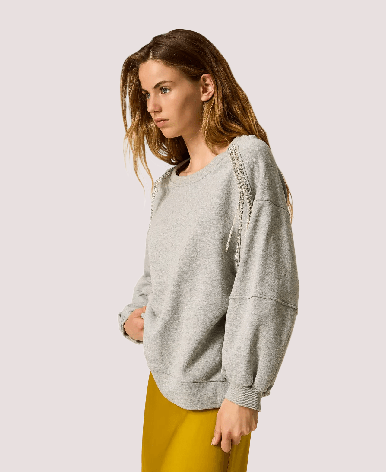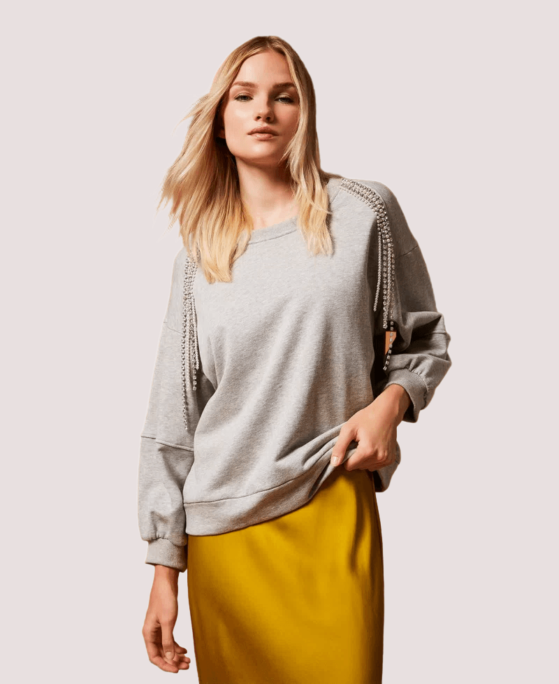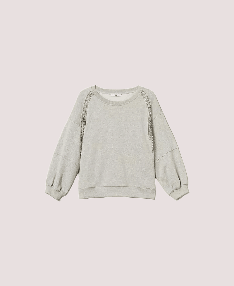 Felpa in cotone con maniche lunghe raglan ricamate da catene di strass e perle lasciate libere al fondo. Ha collo tondo ampio e polsi rifiniti a costine, placchetta logo in metallo sul retro, linea morbida.