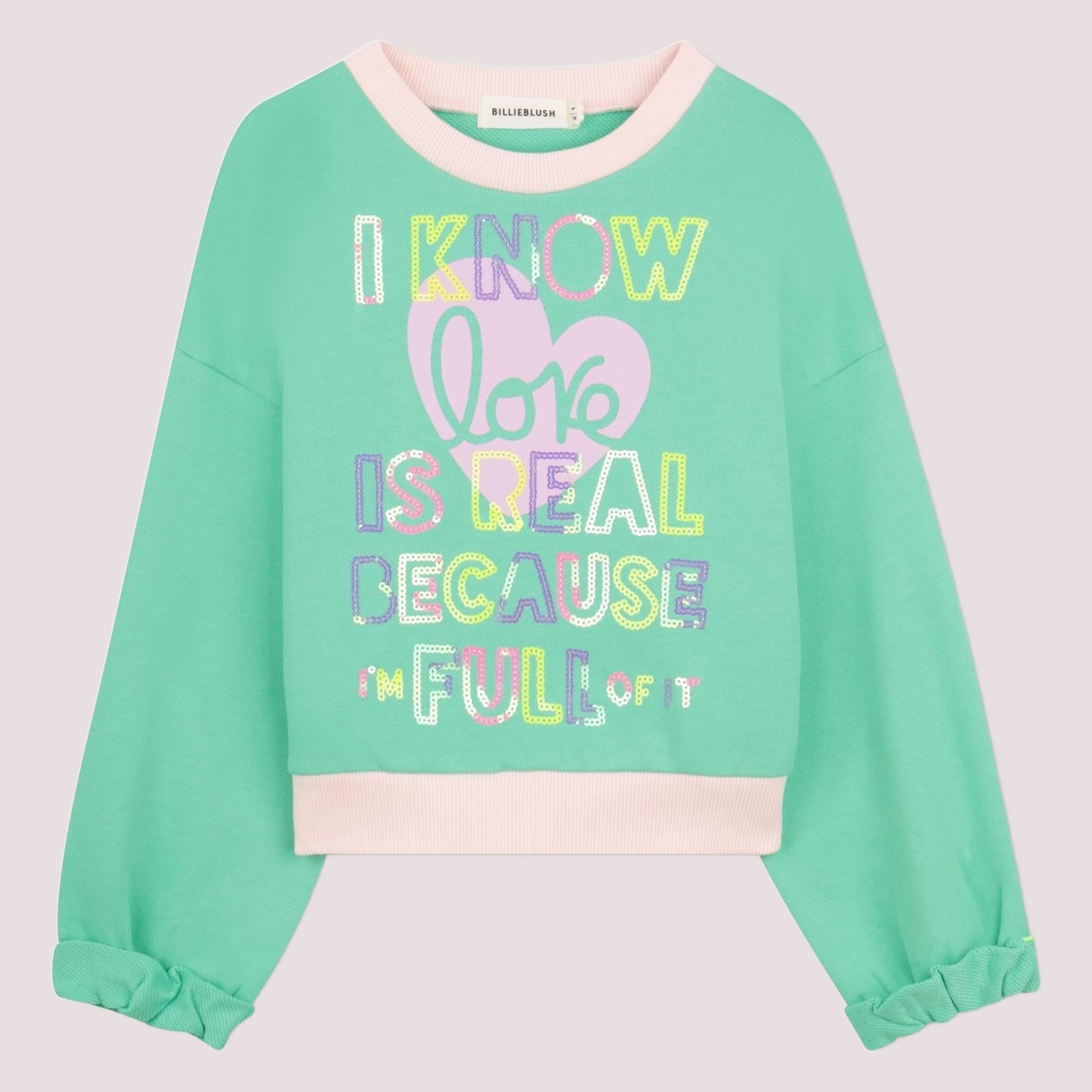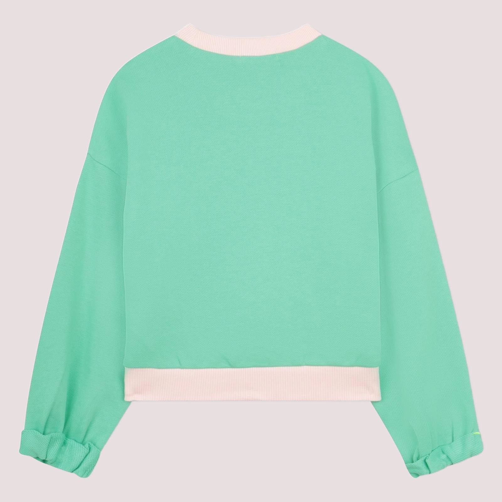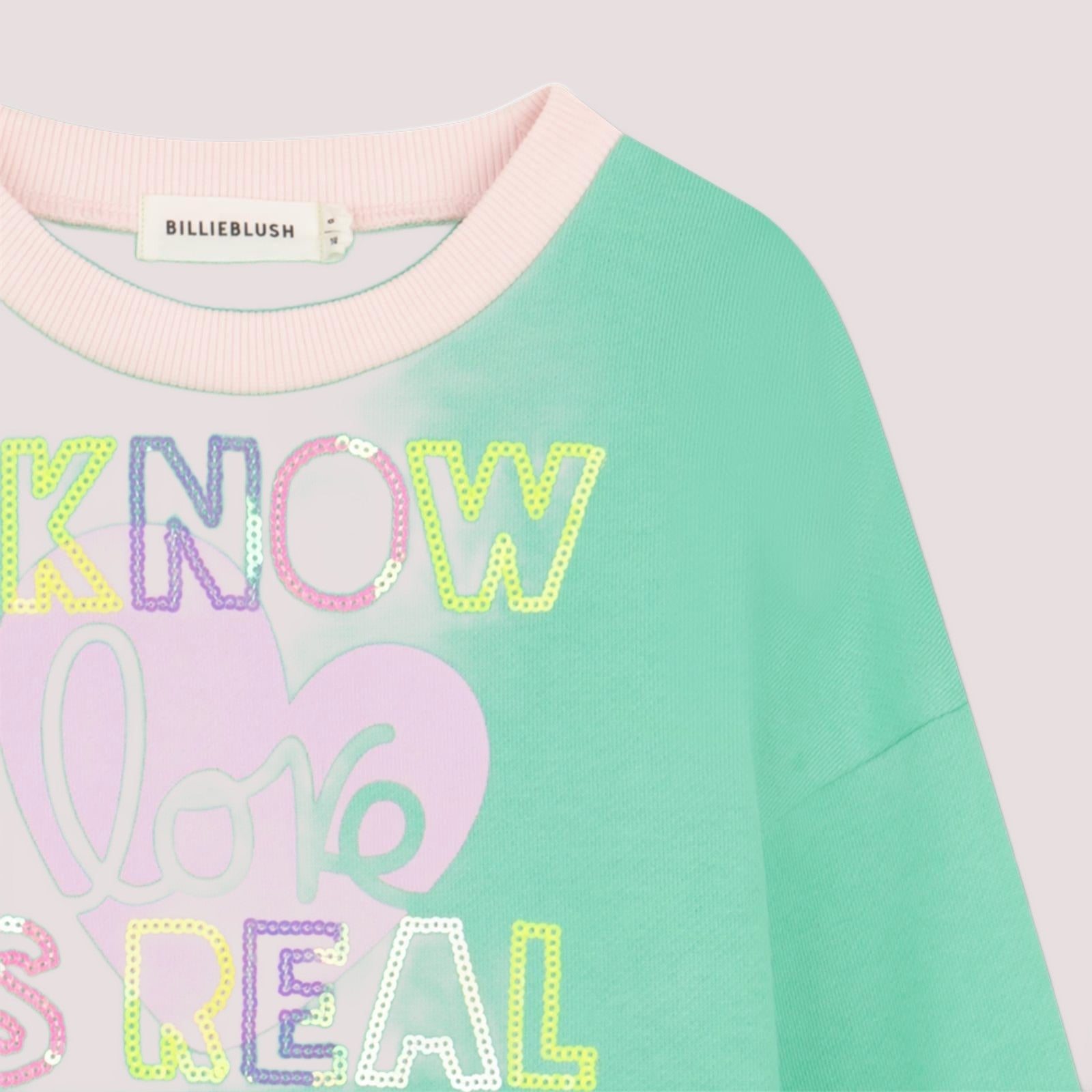 Maglione in spugna francese, costine a contrasto su scollo e fondo, illustrazione con paillettes.