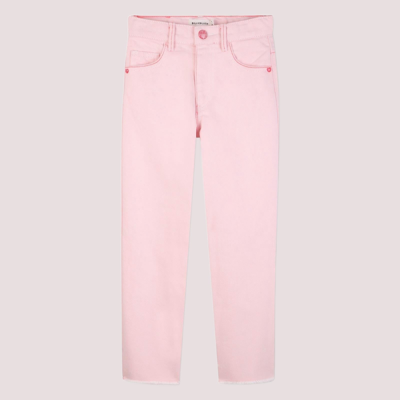 Pantaloni in twill bicolore, 5 tasche. Tasca posteriore con paillettes. Vita regolabile, chiusura con cerniera, etichetta in silicone glitterato in vita.