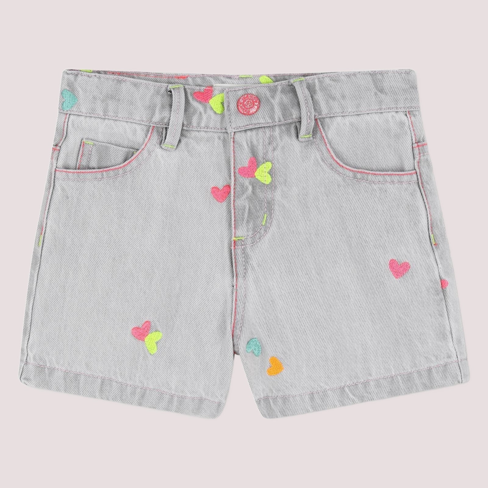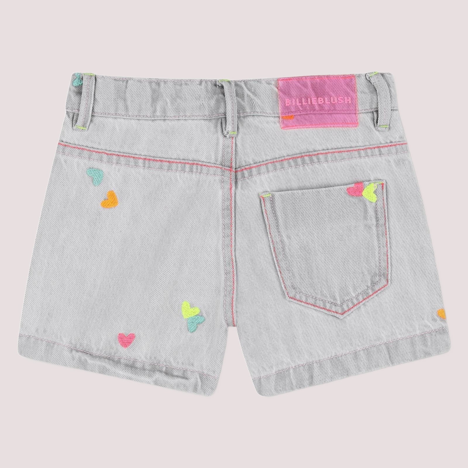 Shorts in denim, ricamo a cuore multicolore. Vita regolabile, elegante chiusura a scatto e cerniera. Etichetta Billieblush in silicone in vita