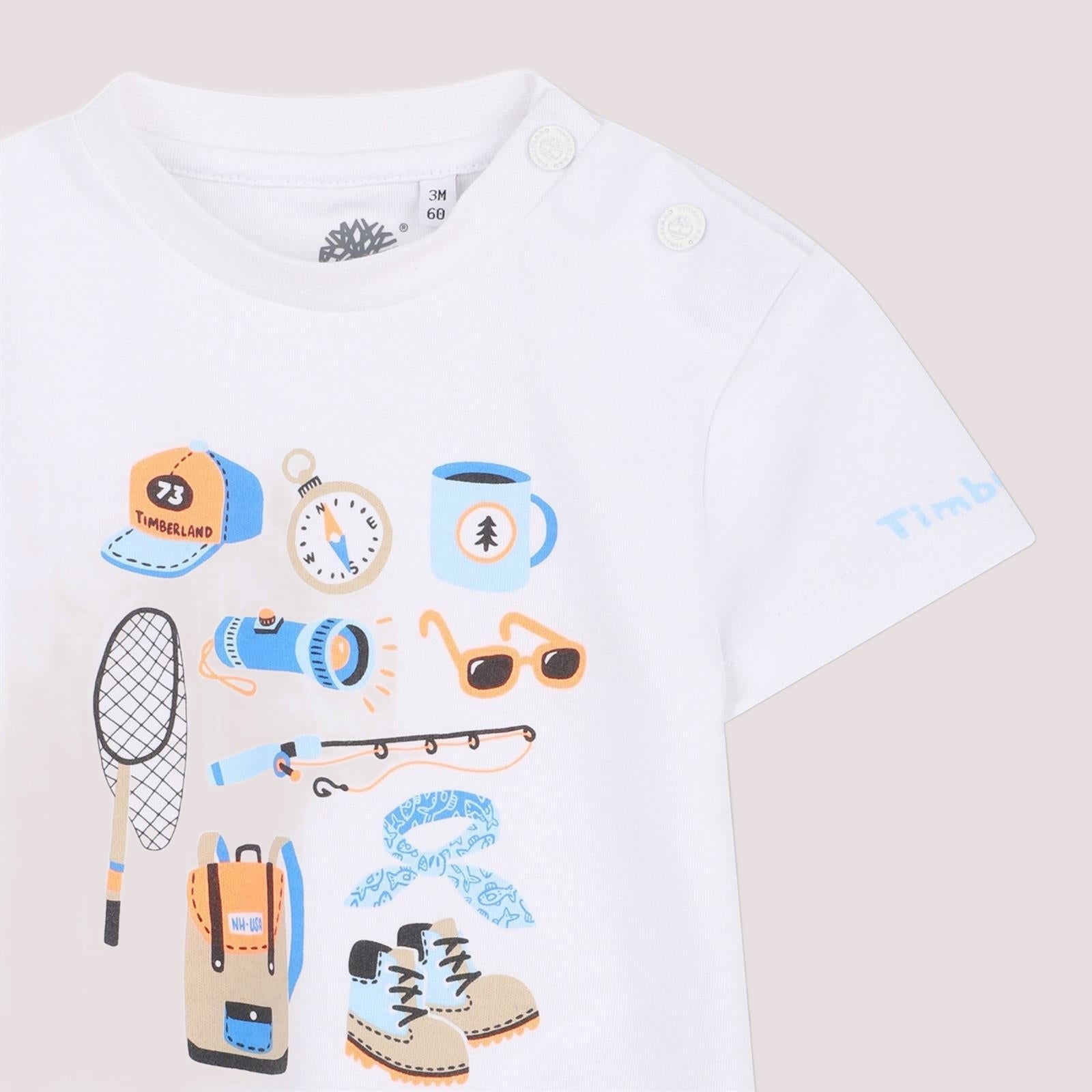T-shirt a maniche corte in interlock 100% cotone proveniente da agricoltura biologica, chiusura a scatto sulla spalla, illustrazione stampata sul davanti e logo stampato sulla manica.