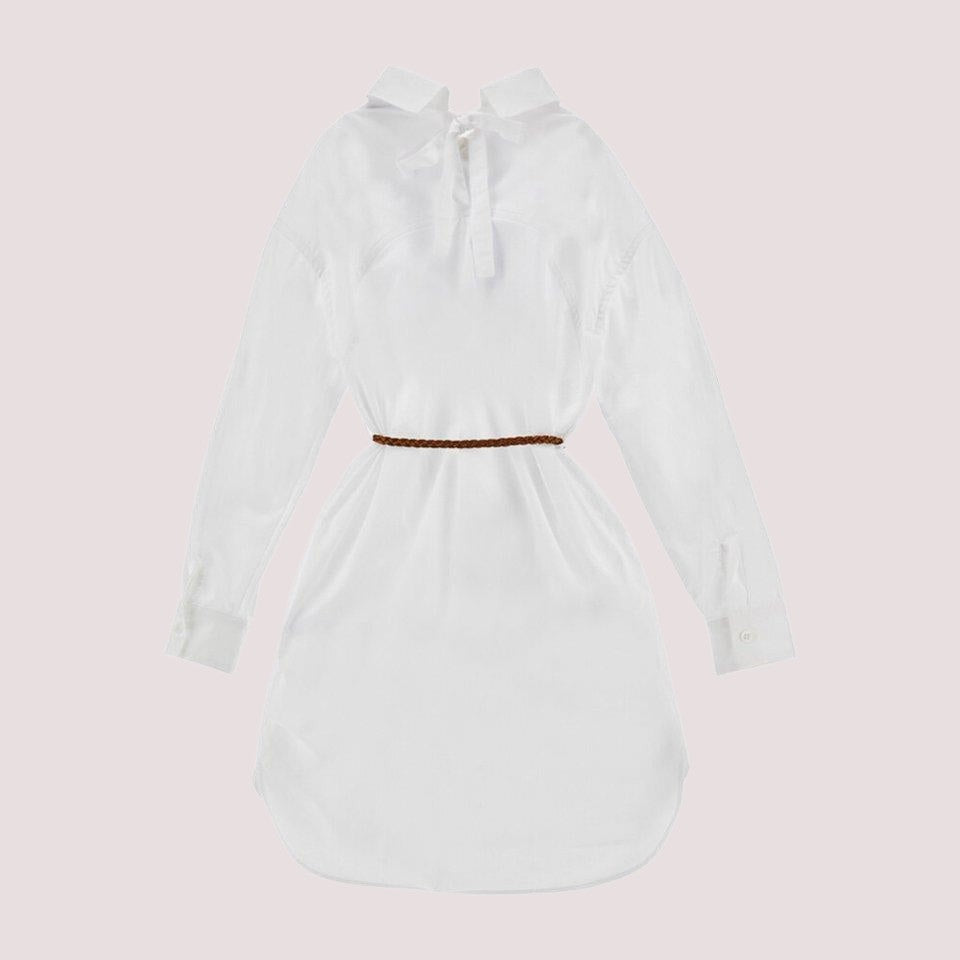 Abito Ermanno Scervino in tessuto leggero e fluido, studiato per offrire comfort e una vestibilità femminile valorizzata dalla struttura morbida. Il modello presenta colletto classico, maniche lunghe con polsini rifiniti, inserto centrale decorato da ricami in pizzo tono su tono e cintura intrecciata in vita che definisce la silhouette, con fondo leggermente arrotondato per un tocco contemporaneo. Un capo elegante e raffinato, ideale da indossare sia di giorno che per occasioni speciali, perfetto con calzature essenziali o accessori ricercati.