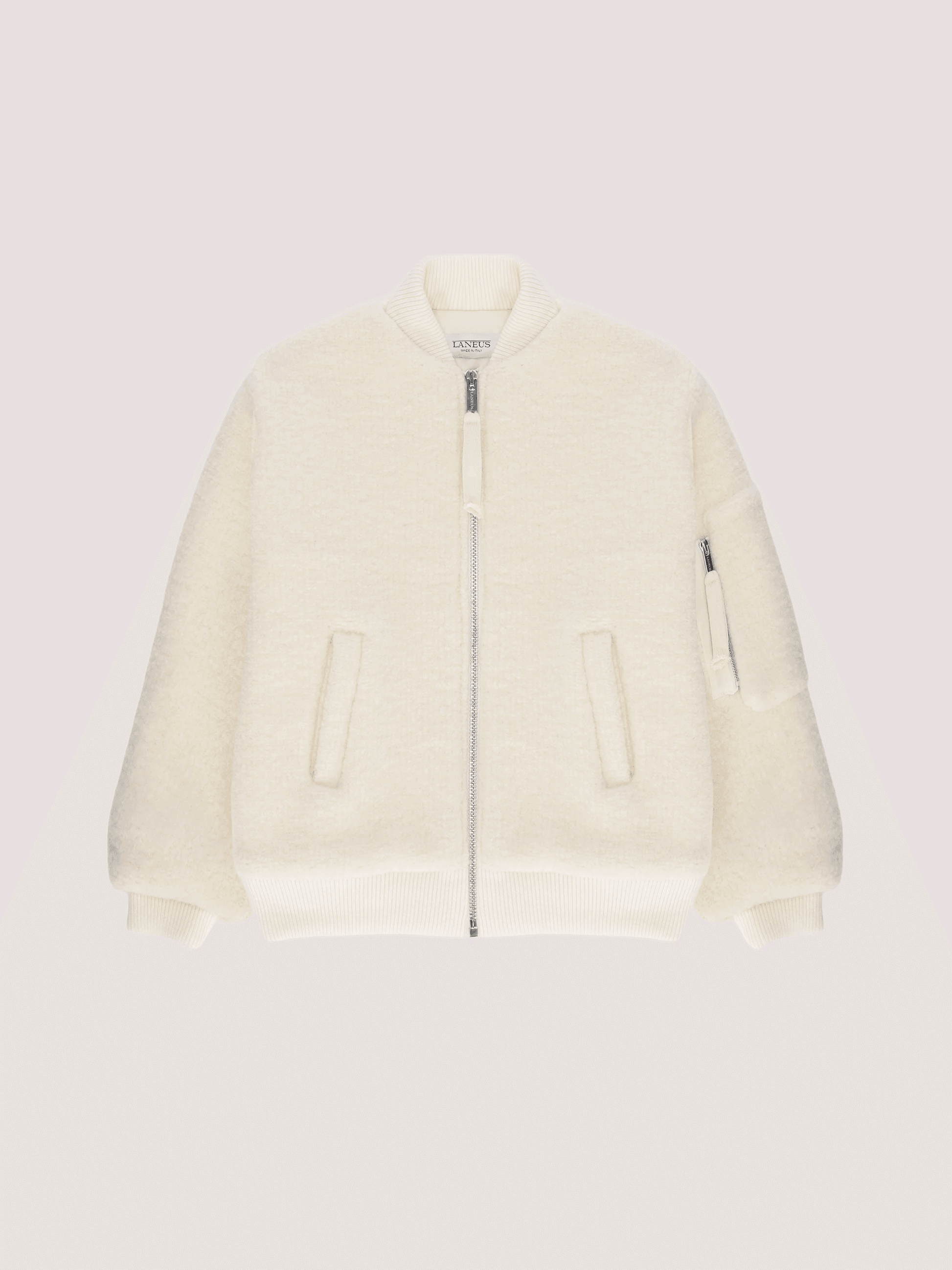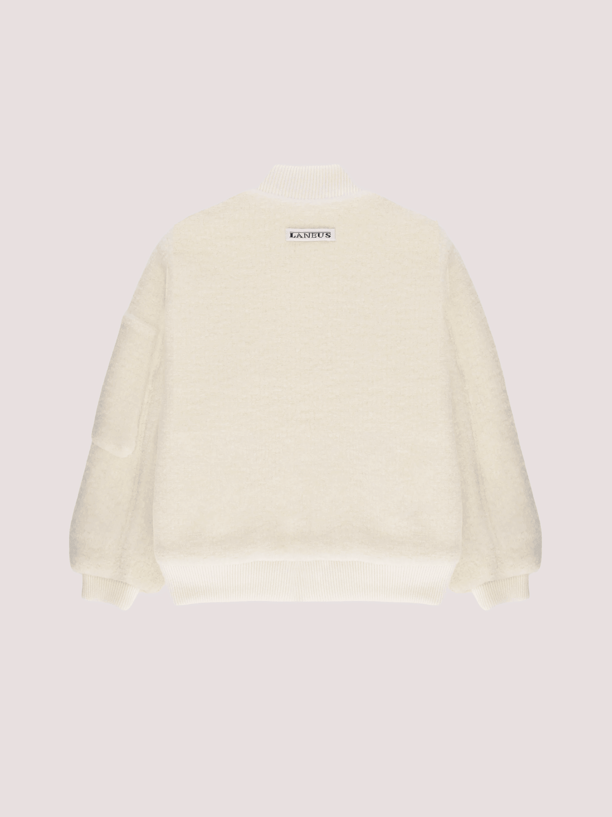 Bomber over da bambina/o firmato Laneus, realizzato in morbida maglia bouclé di lana vergine. Presenta chiusura frontale con zip, tasche laterali a filetto e taschino utility sulla manica con zip e tiretto in maglia. Rifinito con polsi, collo e fondo in maglia a costine tono su tono, è completamente foderato in cotone per il massimo comfort.90% EST:LANA VERGINE 8% FIBRA POLIAMMIDICA/NYLON 2% ELASTAN 100% INT: COTONE