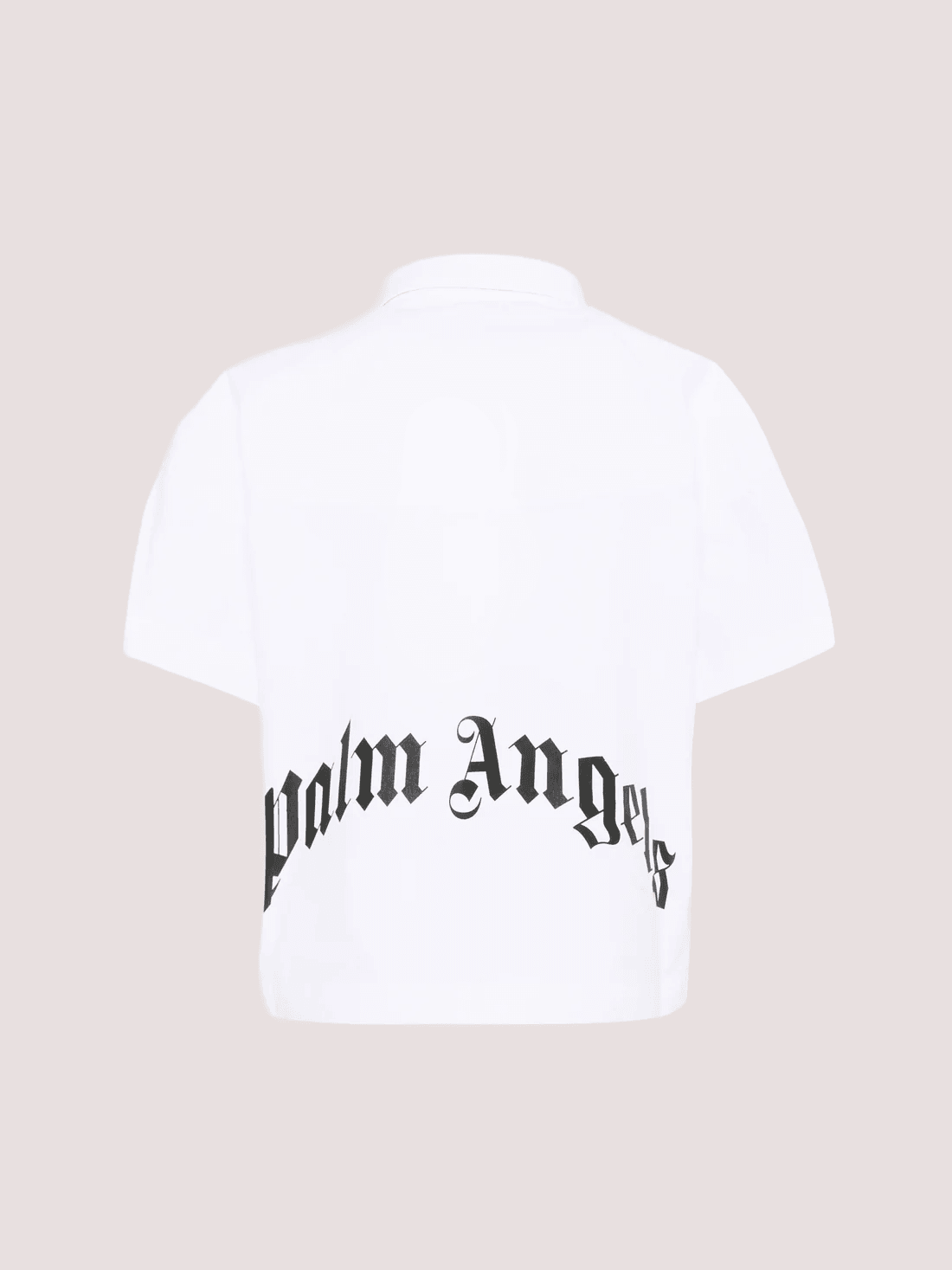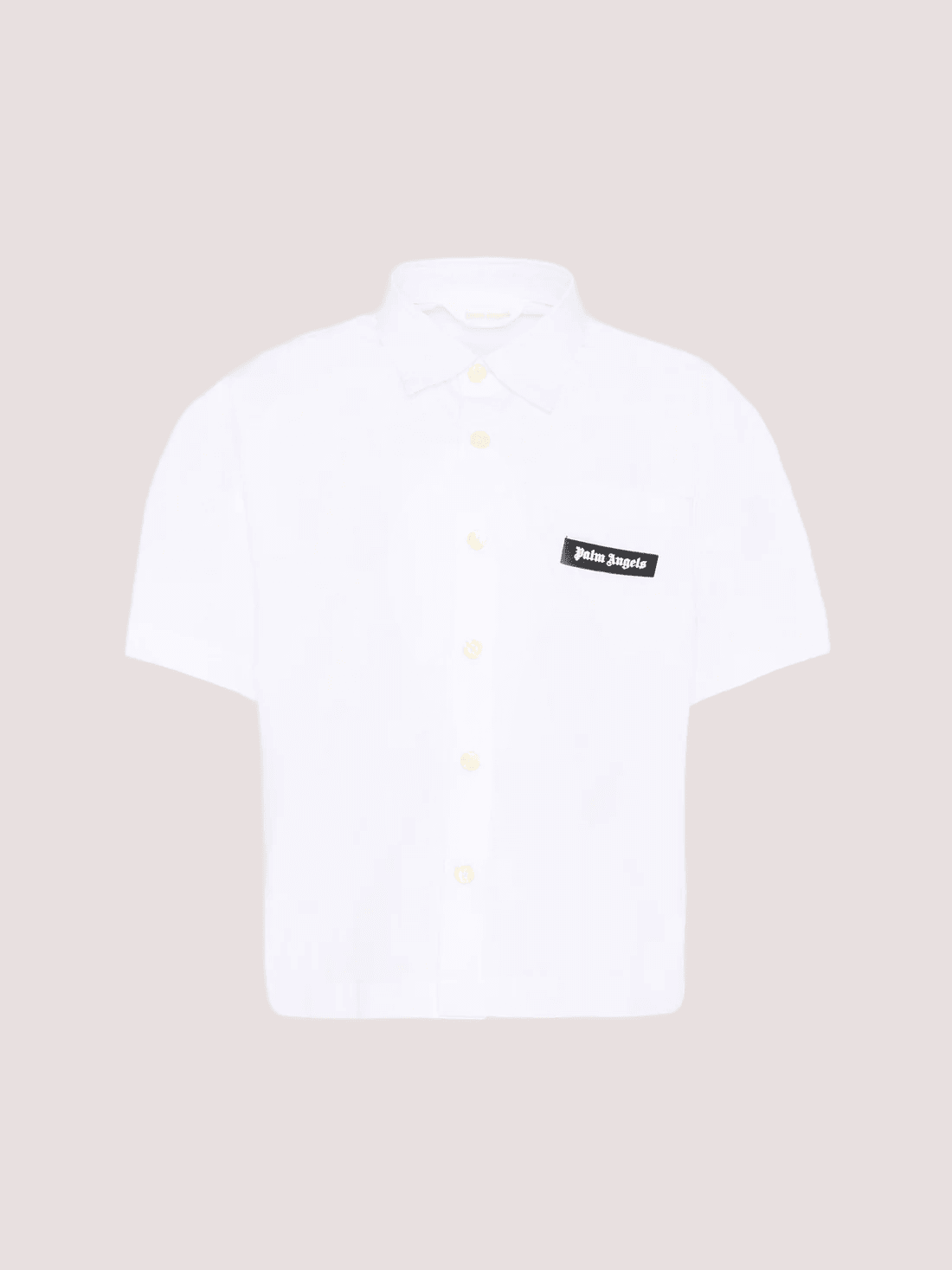 Camicia a manica corta in popeline di cotone Palm Angels dalla linea pulita e leggermente boxy. Il modello bianco presenta colletto classico, abbottonatura frontale e taschino sul petto rifinito da logo patch a contrasto. Sul retro, maxi logo Palm Angels in lettering gotico nero che richiama il DNA streetwear del brand. Orlo dritto e maniche corte strutturate completano un profilo grafico e contemporaneo.Composizione: 100% CotoneCura del capo: Lavaggio a mano