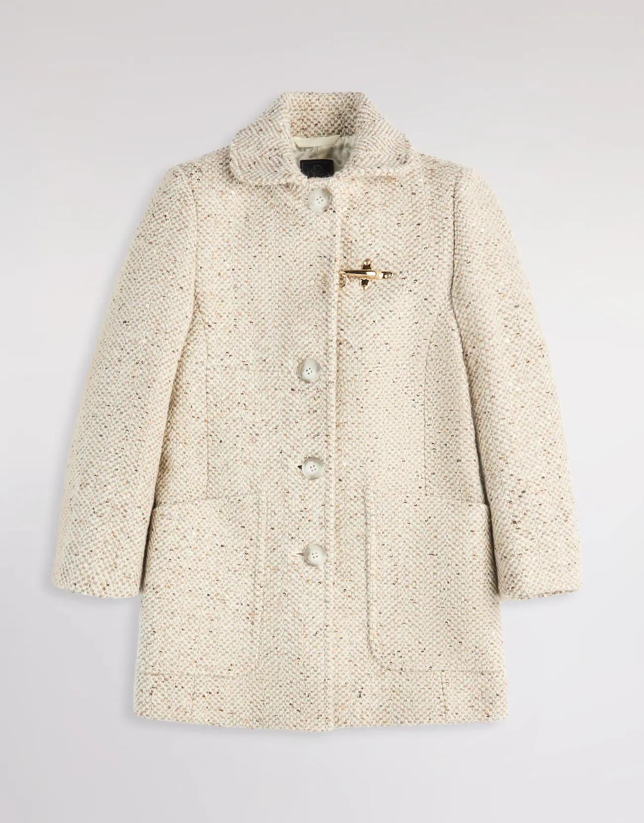 Cappotto misto lana con motivo spigato e paillettes. Chiuso con bottoni personalizzati e iconico gancio Fay sul petto, presenta tasche a toppa con profilo obliquo.
