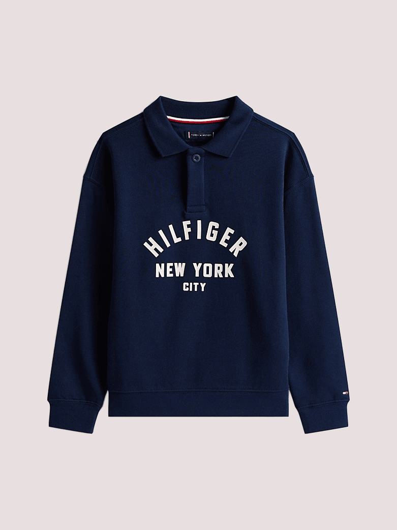 La classica felpa in puro cotone è vivacizzata dall'elegante colletto in stile polo e dalla grintosa grafica con logo curvo sul petto.