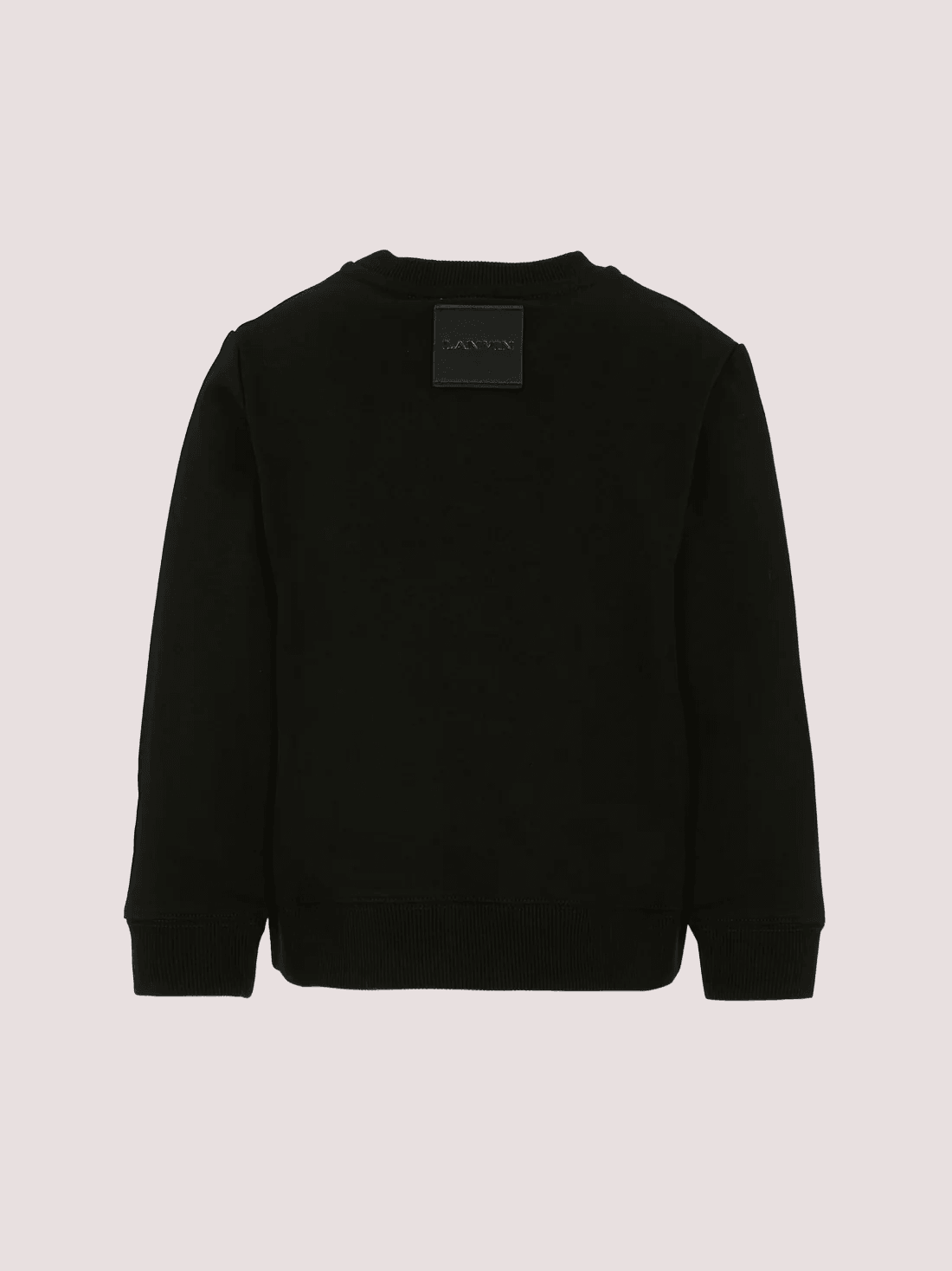 Felpa nera del brand Lanvin Petite, realizzata in morbido cotone organico garzato, per un look casual super cool. Presenta maniche lunghe, girocollo, polsini e orlo a costine. È decorata con logo Lanvin in spugna, sulla parte anteriore e logo in ecopelle, sul retro.