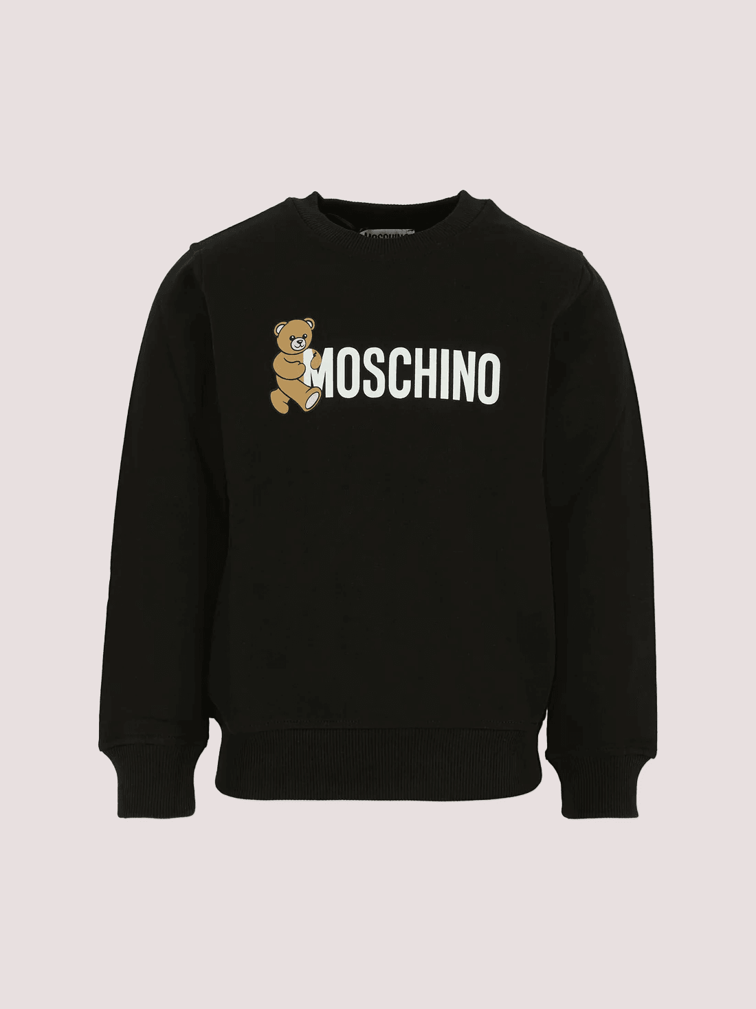 Felpa nera del brand Moschino Kids, in cotone felpato, a maniche lunghe, con girocollo, polsini e orlo a costine. È decorata con stampa Teddy Bear e logo, sulla parte anteriore.