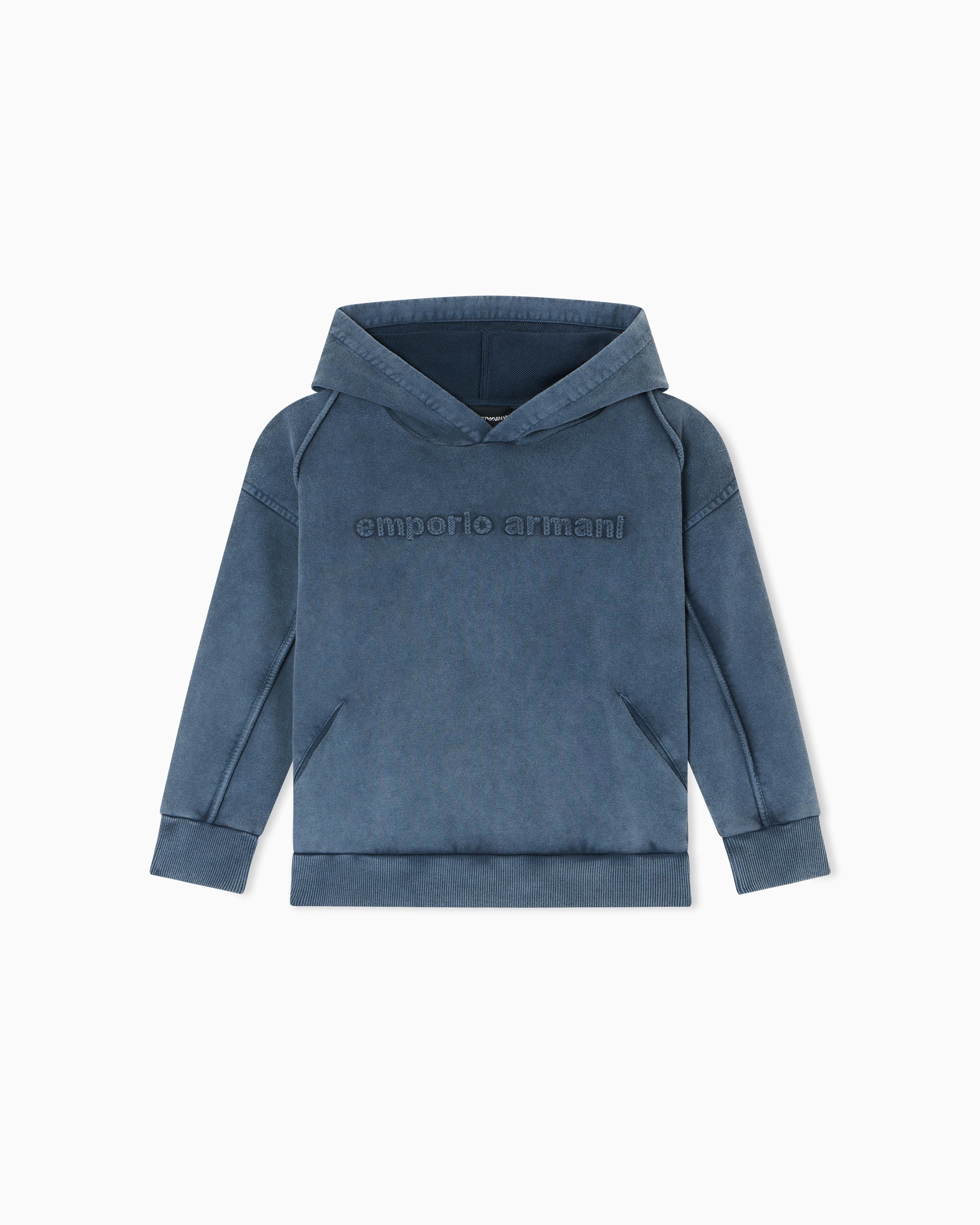 Felpa con cappuccio dalla vestibilità ampia realizzata in jersey e caratterizzata dal lavaggio tinto capo che dona un aspetto fresco ed esclusivo al modello. Logo Emporio Armani a rilievo sul petto.Tessuto: 100% cotone; dettagli in maglia: 96% cotone, 4% elastan