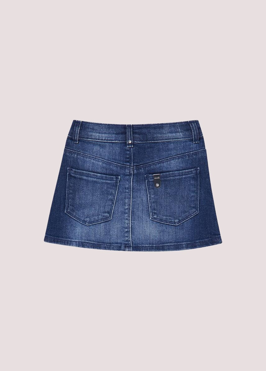 Gonna mini in denimLavaggio stonewash leggeroRicami gioielloComode tascheChiusura con bottone e zip