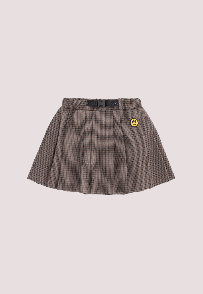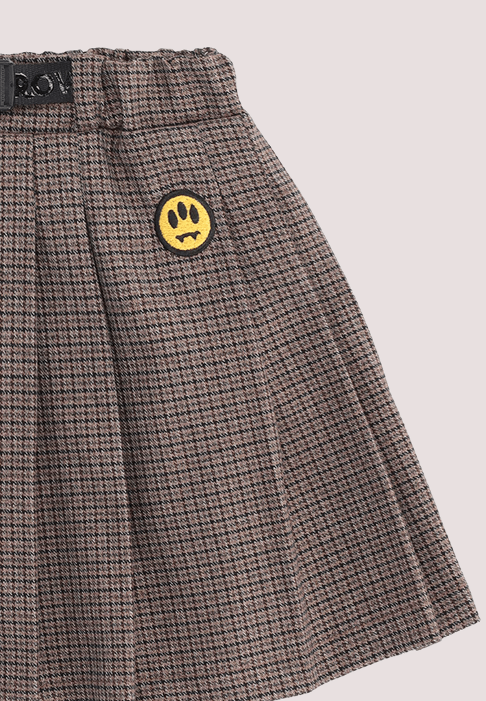 Un classico intramontabile rivisitato in chiave Barrow Kids. Questa mini gonna a pieghe con motivo pied de poule è realizzata in un tessuto misto morbido e strutturato, con vita elasticizzata e dettaglio cinturino con chiusura ad incastro in stile utility. Il logo smile applicato dona un tocco giocoso e riconoscibile. Perfetta da abbinare a felpe o camicie per look contemporanei e divertenti.63% POLIESTERE 34% VISCOSA 3% ELASTAN