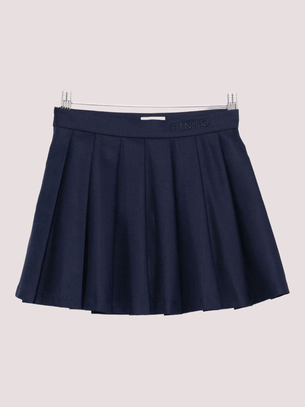 Gonna a pieghe di colore blu , con logo ricamatoe chiusura con zip laterale nascosta.