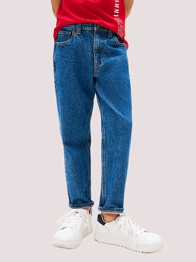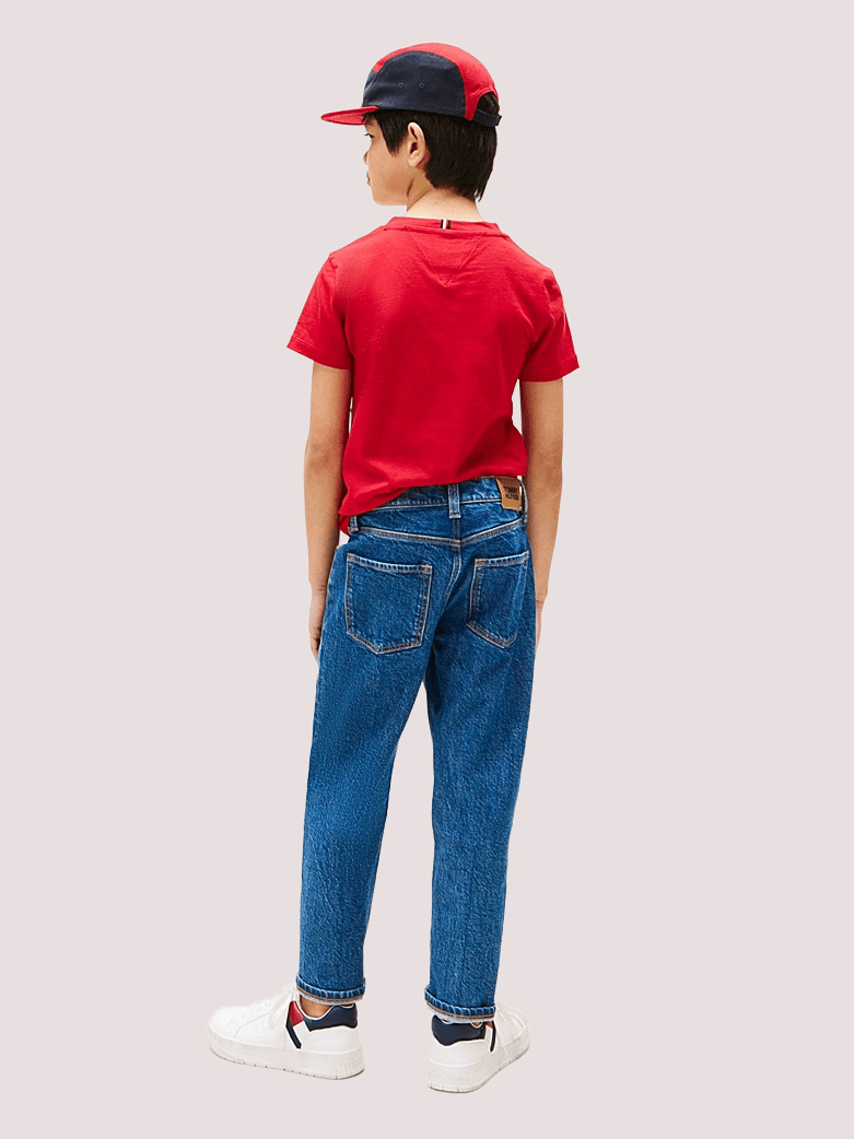 Gli autentici jeans in denim stretch, con lavaggio scuro, sono resi unici dai dettagli iconici sul taschino portamonete, sul bottone e sul retro della vita.