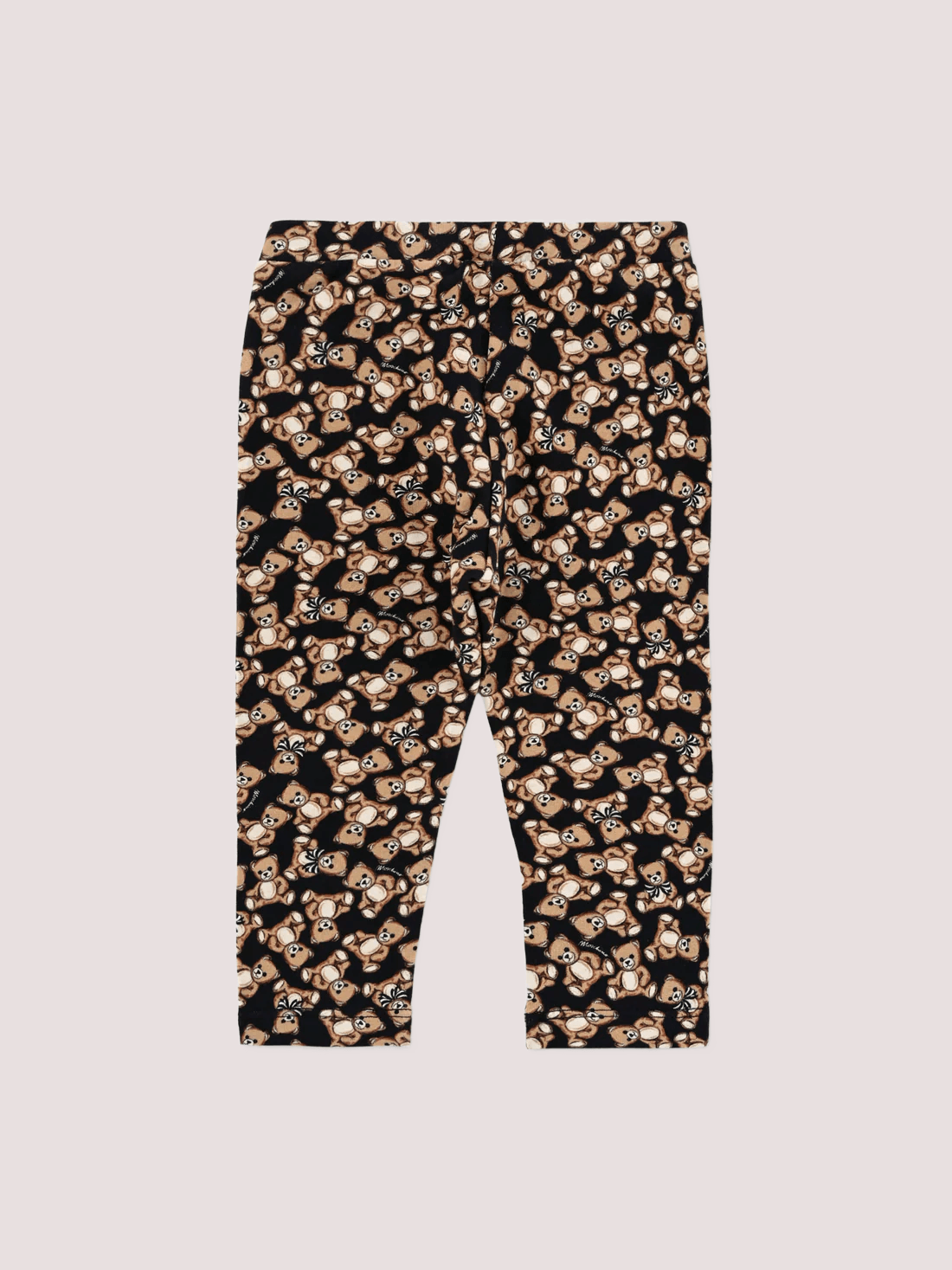 Leggings neri del brand Moschino Kids, realizzati in misto cotone, con vita elasticizzata. Sono decorati con stampa Teddy Bear all-over e patch logato, sulla parte anteriore.