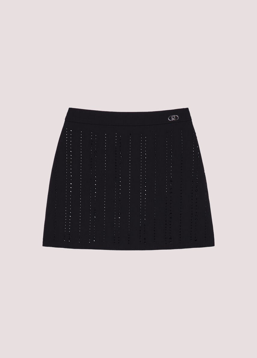 Gonna mini in tessuto tecnico stretchStrass applicati sul davantiChiusura con zip sul lato