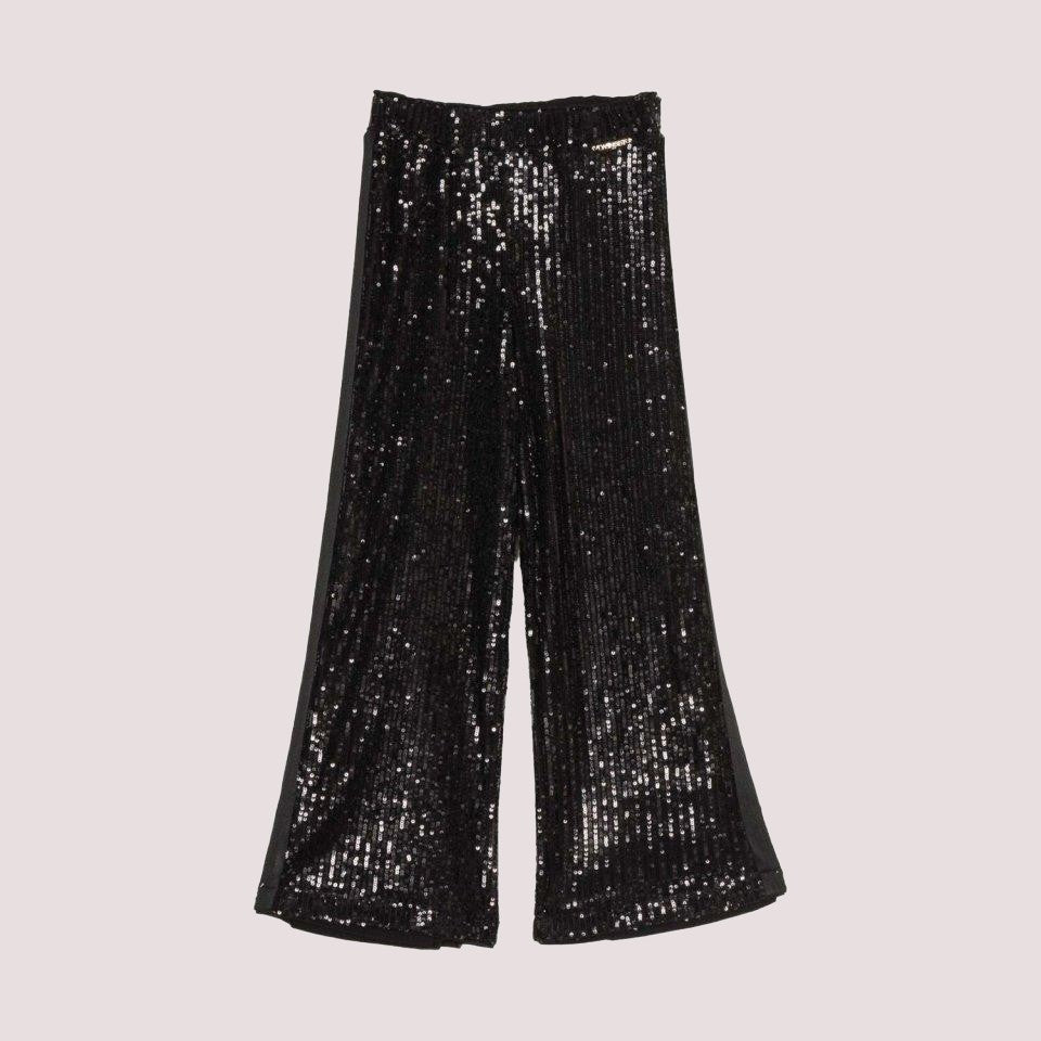 Pantaloni con paillettes che conferiscono luminosità e movimento ad ogni passo. Il modello a gamba ampia presenta vita elasticizzata per un comfort ottimale e una piccola targhetta logo applicata sul punto vita che ne valorizza lidentità.