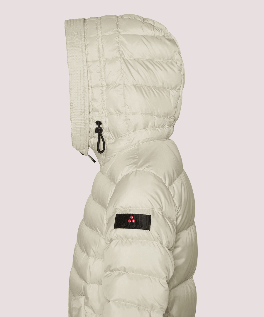 Piumino lungo trapuntato realizzato in tessuto superleggero e compatto, in 100% poliestere riciclato post consumo, con finitura semi-opaca e touch ultra morbido. Il cappuccio fisso, impreziosito da una soffice pelliccia di volpe removibile, dona al capo uno stile unico. Il collo alto, con costruzione a tulipano e impunture decorative, offre una protezione extra quando completamente chiuso. La zip centrale e le tasche con patta completano il design con cura. Imbottito in piuma naturale certificata e trattato con finitura idrorepellente PFC Free, priva di sostanze chimiche nocive, Γ¨ il capo ideale per accompagnare le giovani trendsetter nelle giornate piΓΉ fredde.