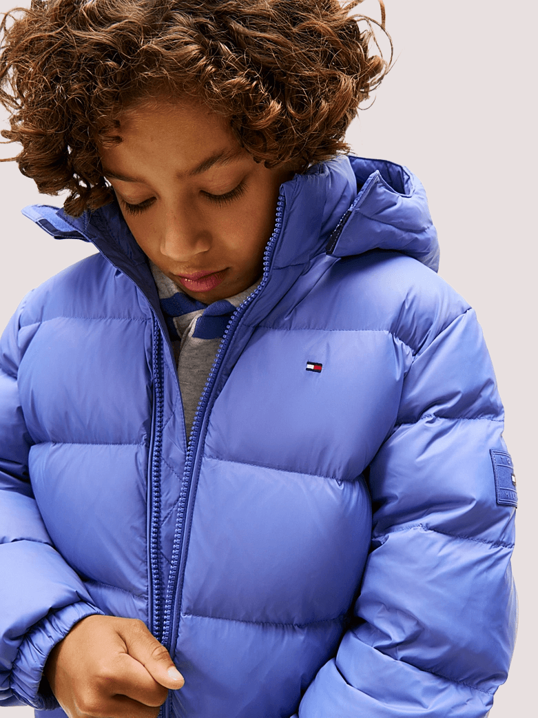 Il piumino con cappuccio, imbottito in morbidissima piuma e dotato di pratici polsini elastici, è l'alleato ideale per proteggersi dal freddo.