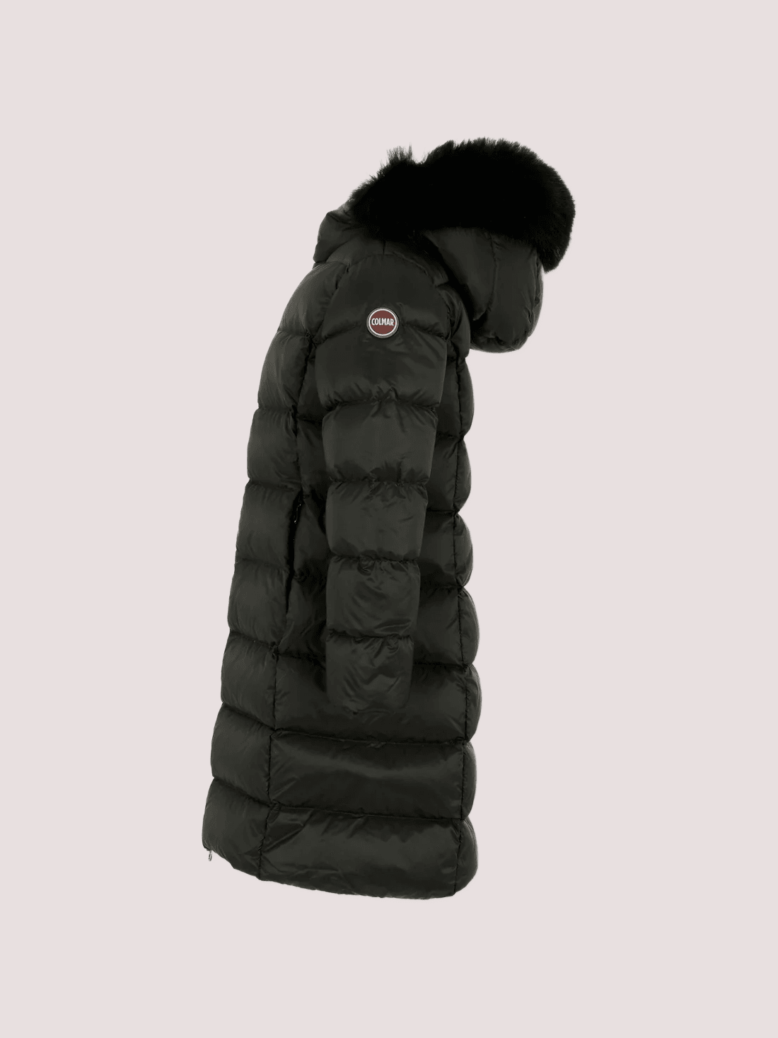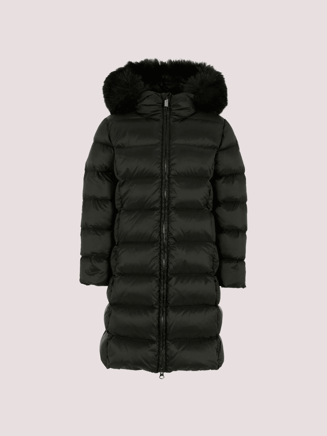 Piumino lungo nero pesante, imbottito e trapuntato, a maniche lunghe, con cappuccio e dettaglio in ecopelliccia removibile, chiusura frontale con zip e tasche laterali con zip. È decorato con patch logato, applicato sulla manica.