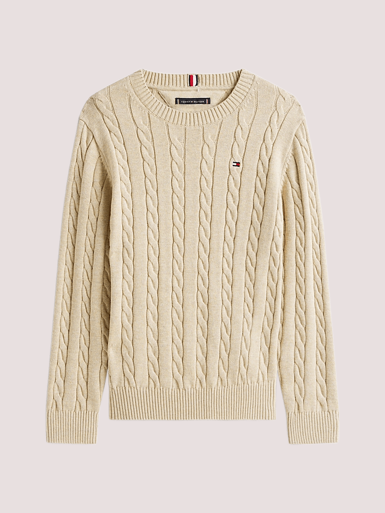 Il pullover in puro cotone pettinato, con maglia intrecciata e bandierina ricamata, è un capo basic per outfit eleganti o per serate di relax.