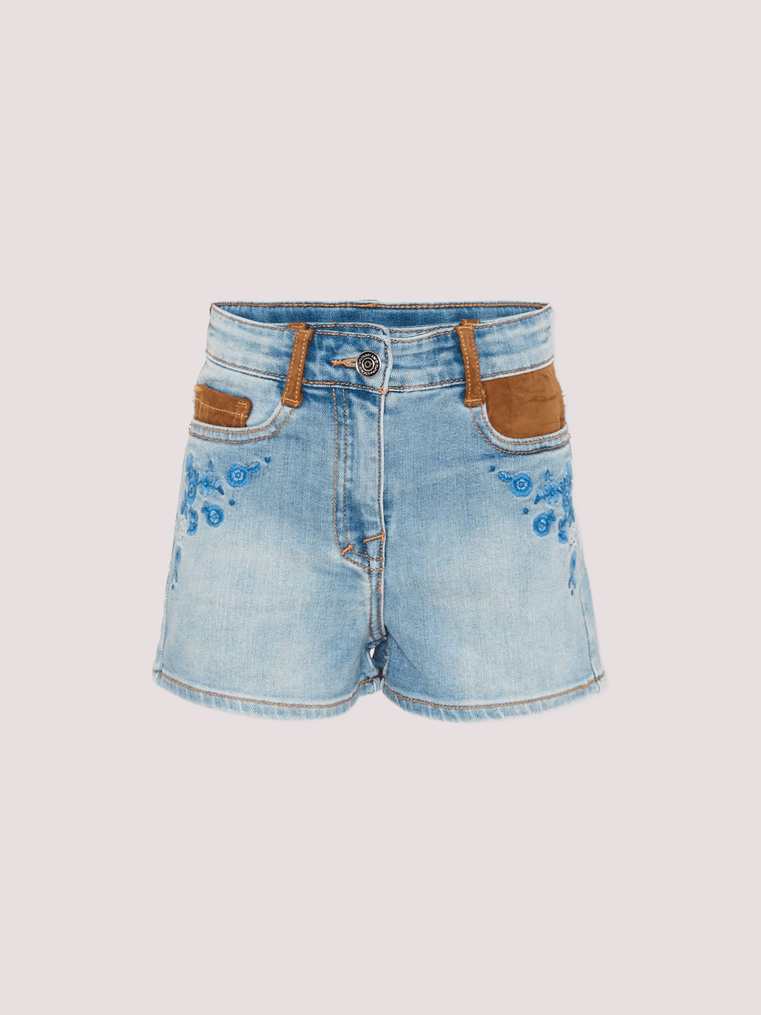 Shorts in denim chiaro impreziositi da delicati ricami floreali azzurri sul davanti. Dettagli in suede color cuoio sulle tasche e passanti in vita donano al capo un tocco ricercato e contemporaneo.
